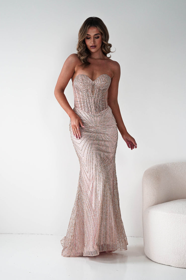 Elyse Glitter Strapless Gown | Rose Gold