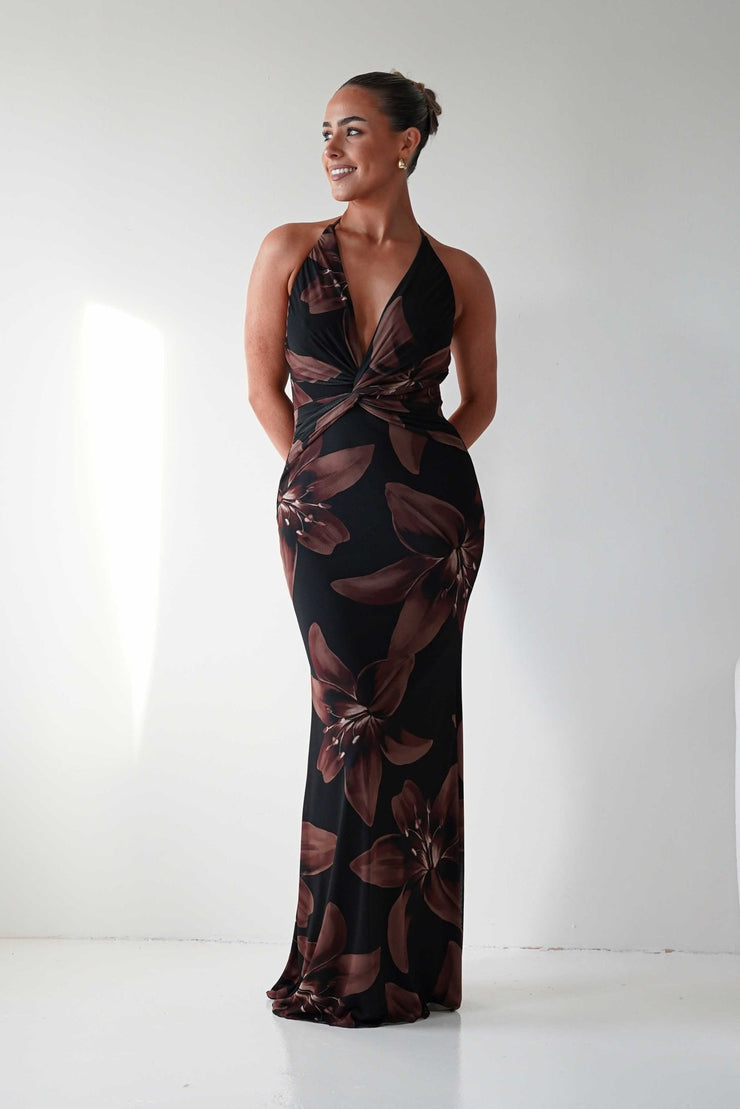 Adilah Halter Neck Floral Maxi Dress | Black/Brown