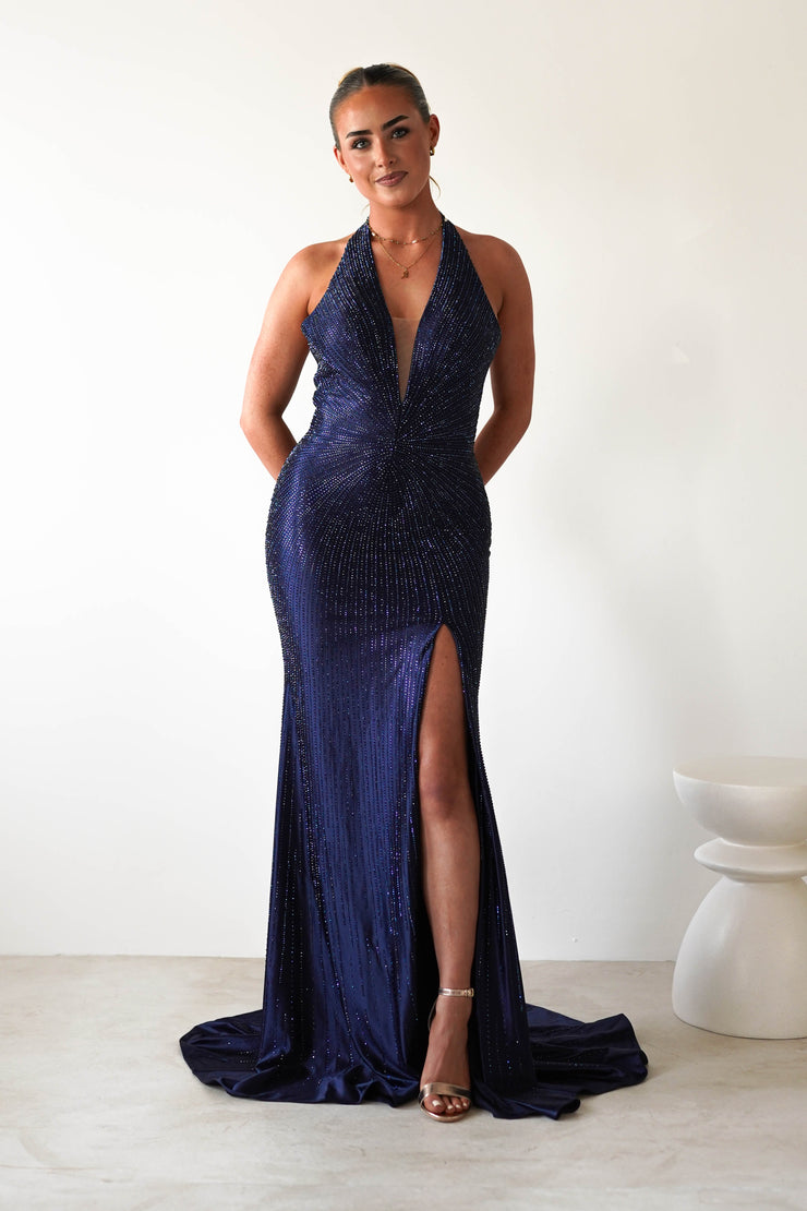 Adeline Rhinestone Halterneckneck Balklänning | Marinblå