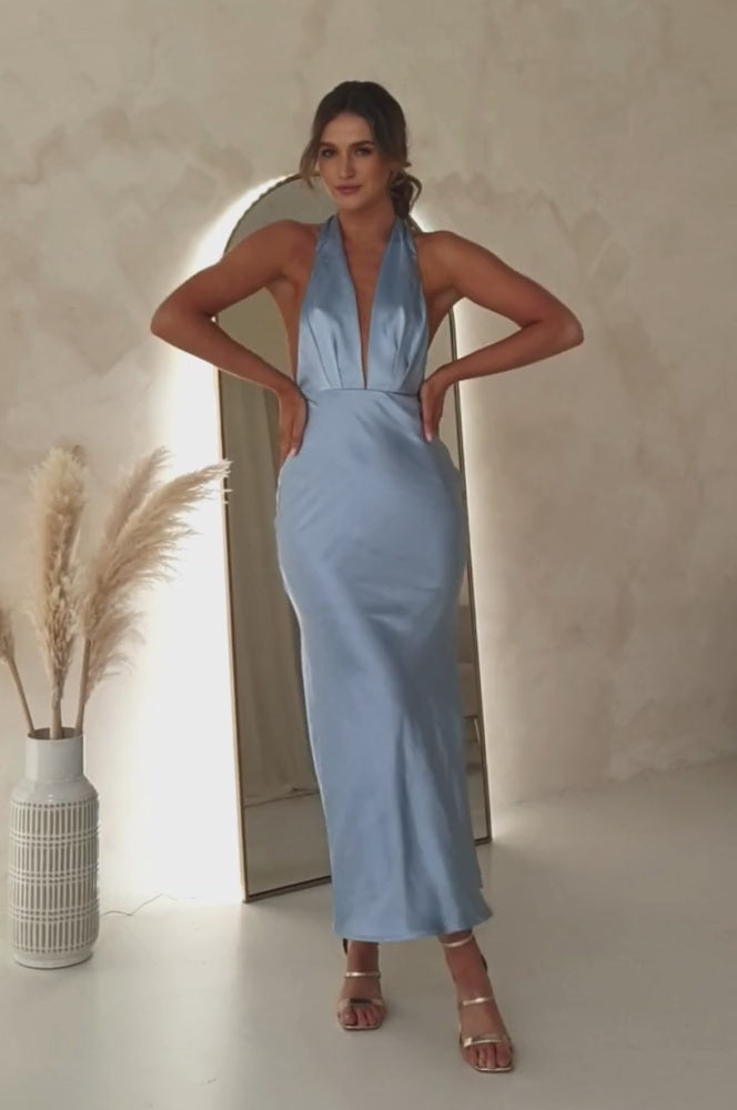 Kaylah Satin Halter Neck Maxi Dress | Light Blue